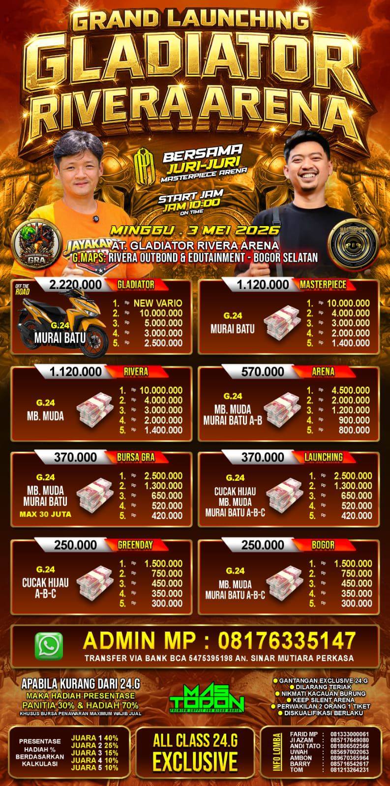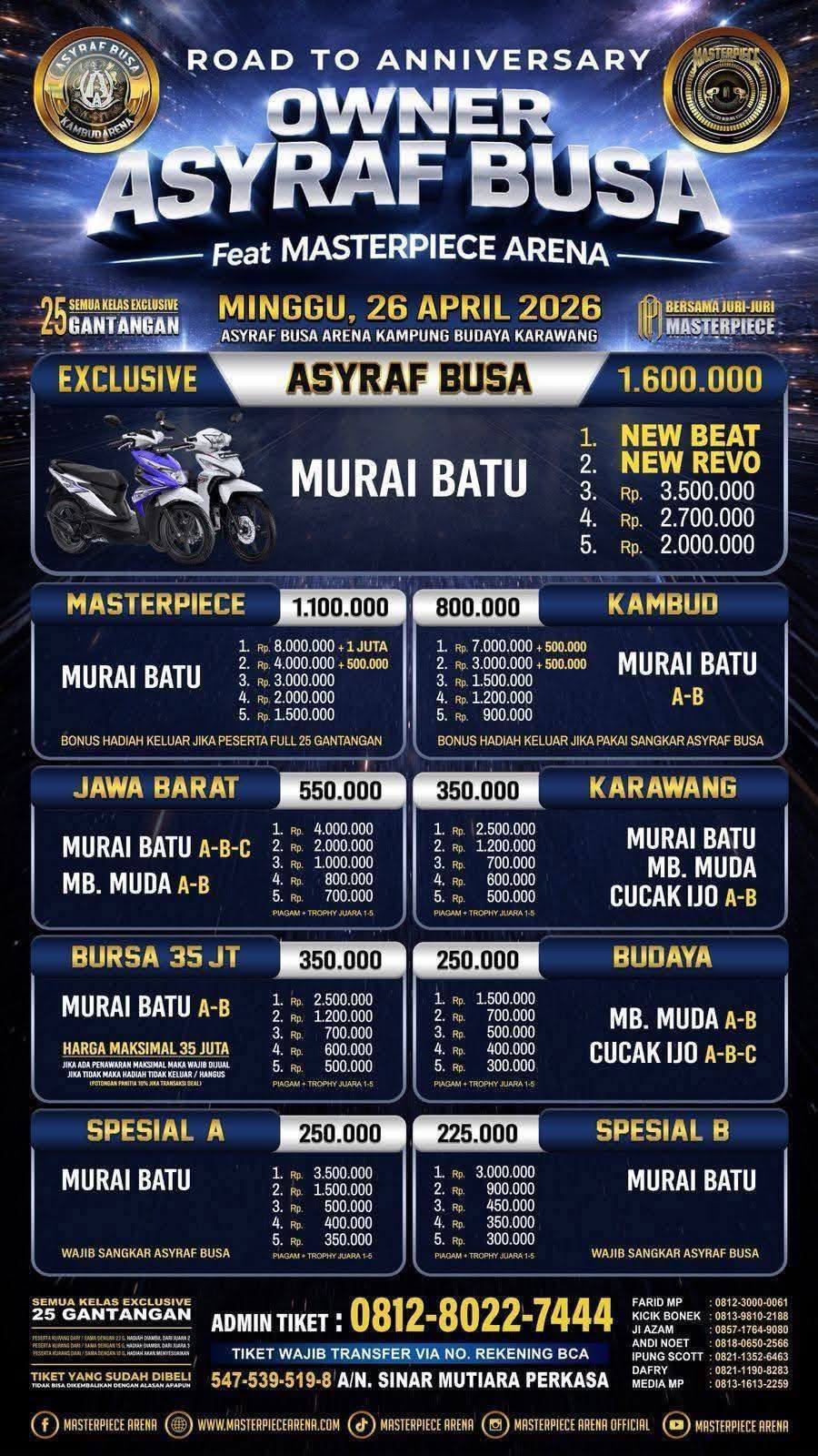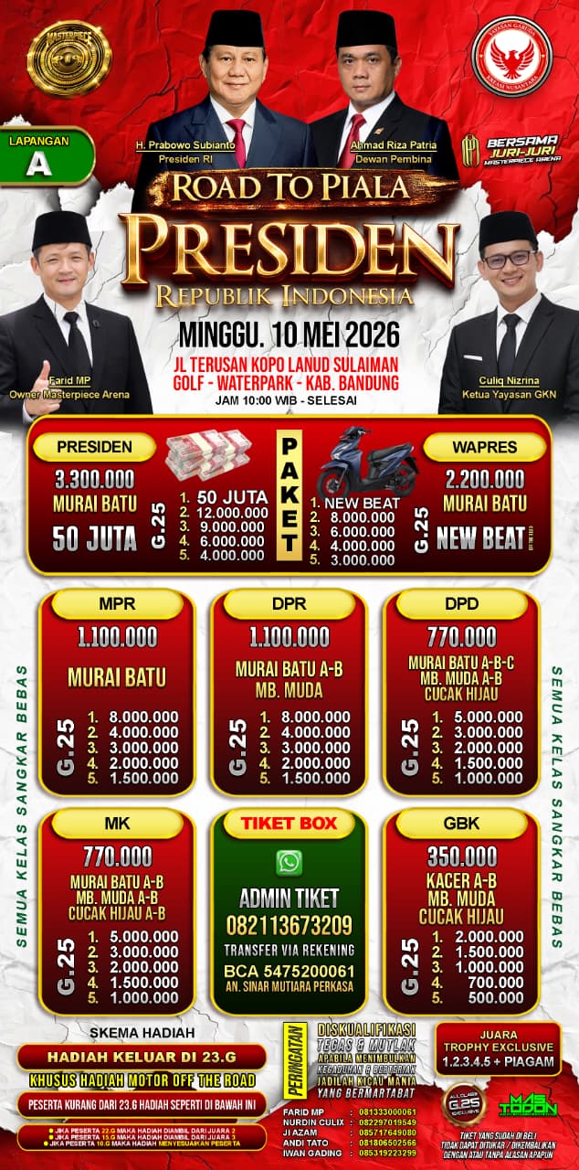 Berikut data para jawara event Masterpiece Arena. Kumpul 1 Titik Jawara Nusantara. Minggu, 15 Februari 2026, Samsat Bsd...