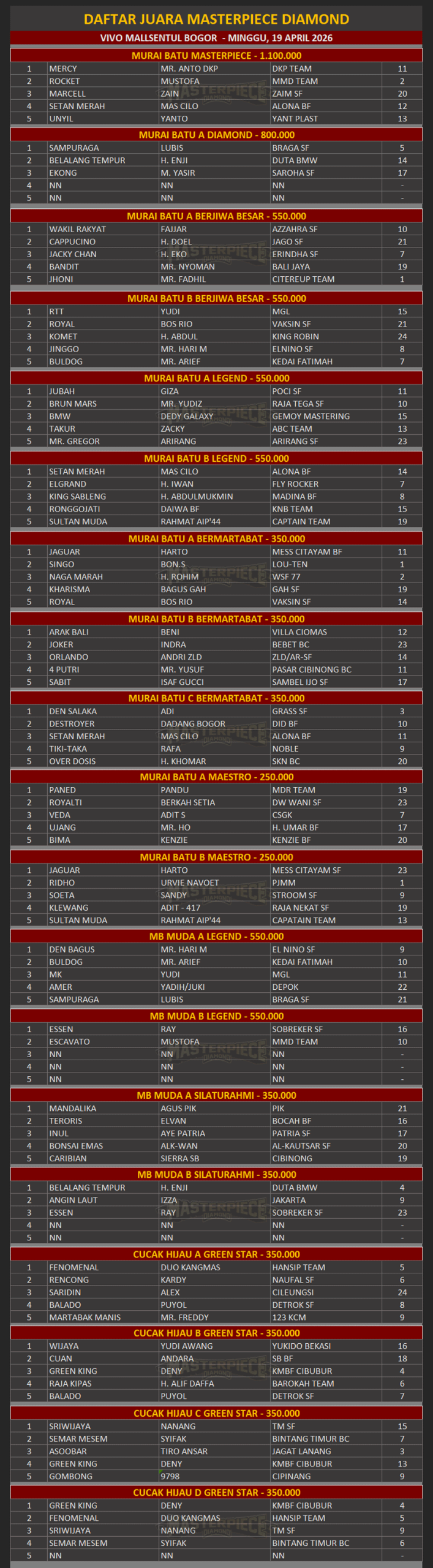 DAFTAR JUARA MASTERPIECE DIAMOND SENTUL BOGOR, 19 APRIL 2026