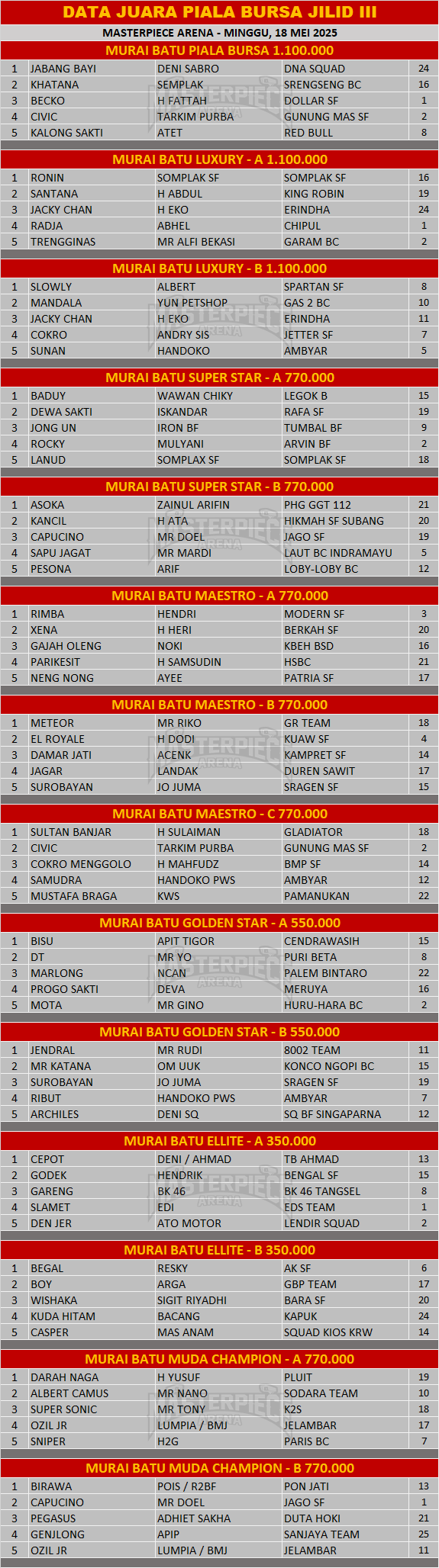 “Alhamdulillah, gelaran Piala Bursa Jilid III berjalan dengan aman, lancar dan sukses. Terima kasih kepada seluruh kicauy mania yang hadir. Selamat kepada para juara, jangan berkecil hati yang belum hoki. Tetap semangat, salam seduluran kicau mania nusantara,” pungkas ji Azam.