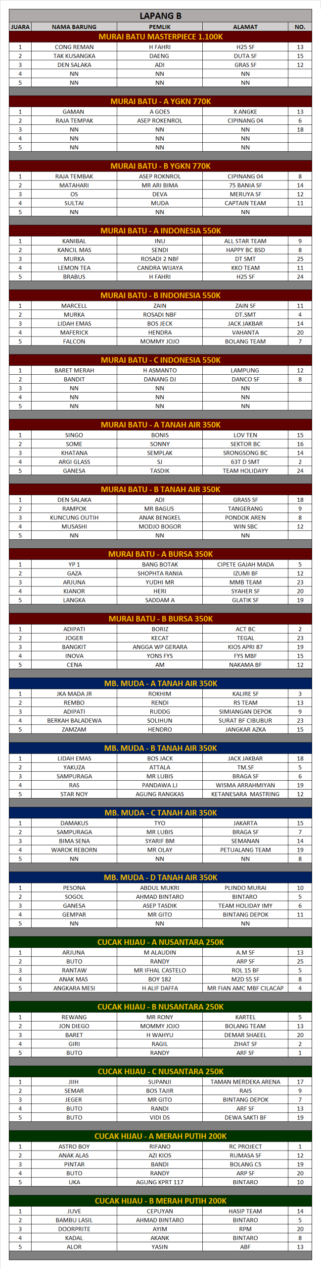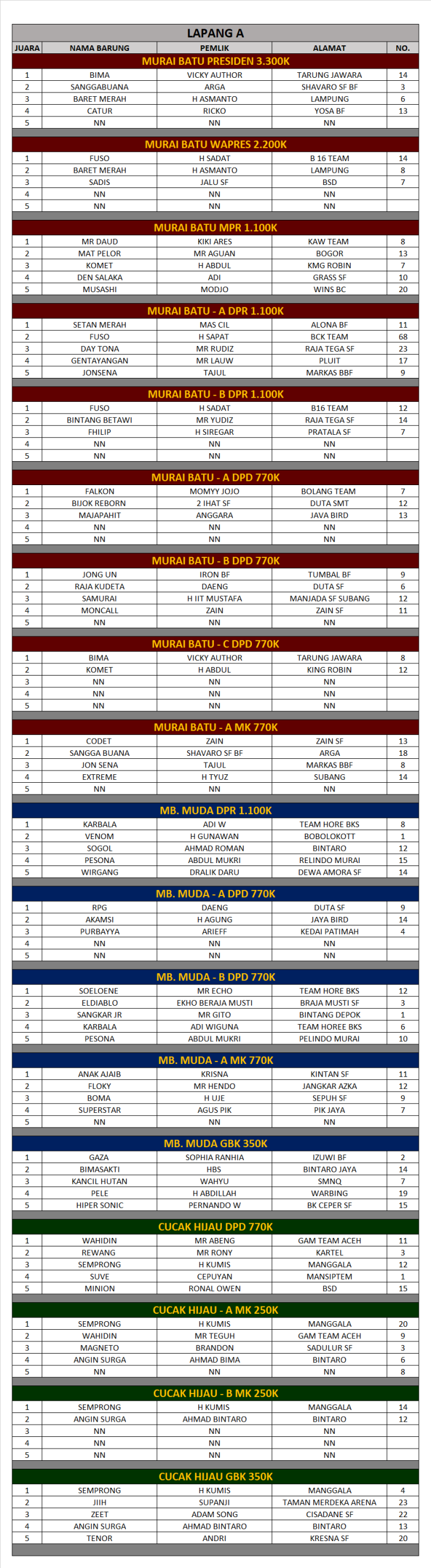 Berikut daftar para juara event Road To Piala Presiden Republik Indonesia. Minggu, 15 Maret 2026, Samsat BSD City Serpong Tangerang Selatan.