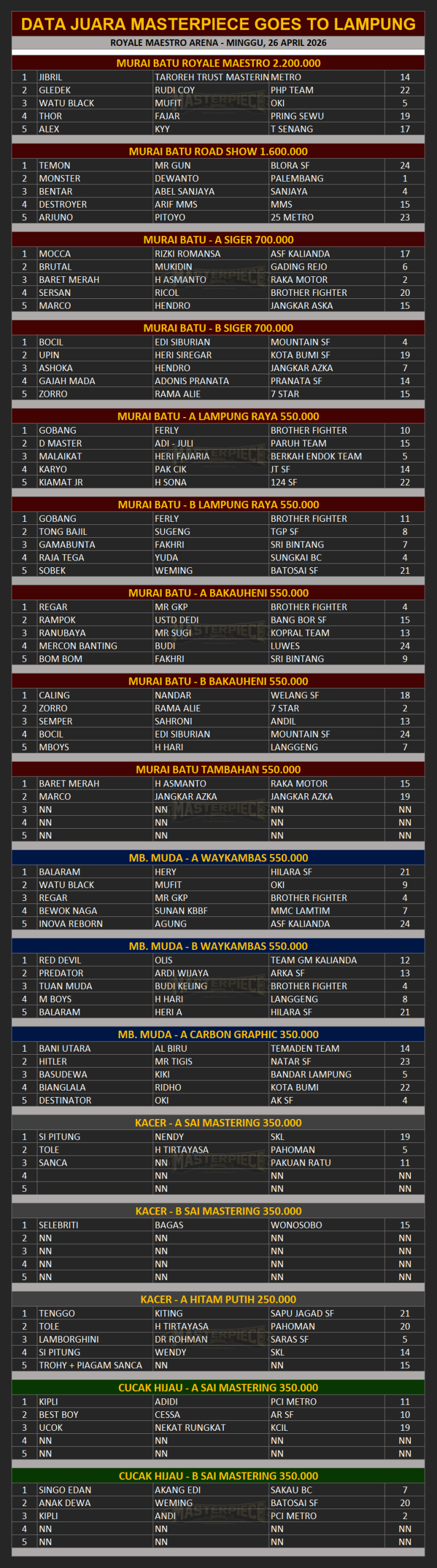 Berikut Data Para Juara Masterpiece Goes To Lampung. Minggu, 26 April 2026 di Royale Maestro Arena Lampung.