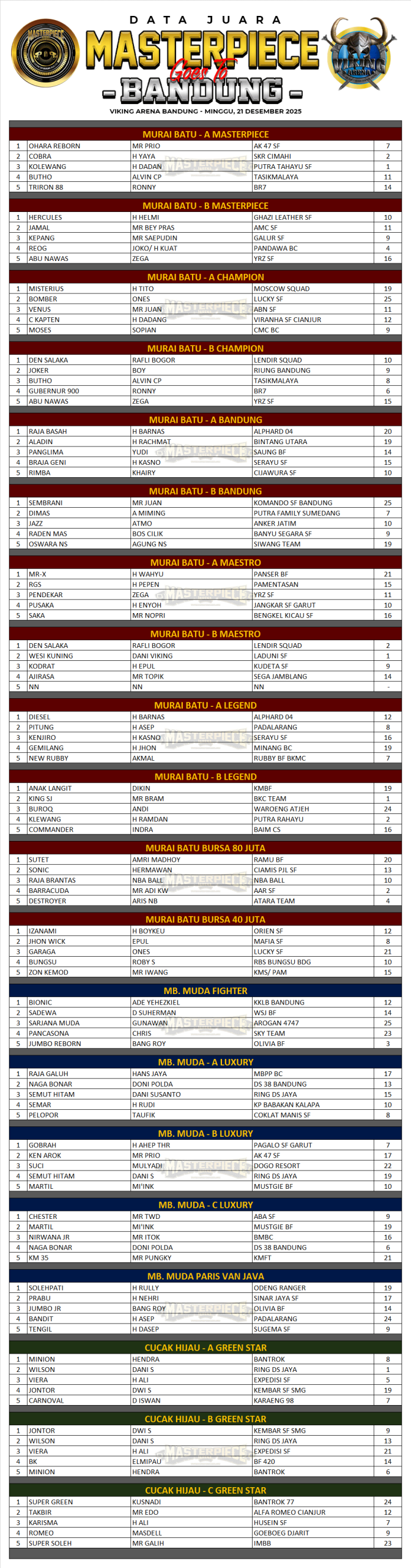 “Alhamdulillah, kita bisa bertemu lagi dengan kicau mania Bandung dan sekitarnya. Antusiasnya sungguh luar biasa. Mudah-mudahan peserta semua puas dengan semua yang kami sajikan di gelaran ini. Mohon maaf apabila ada salah kata. Insya Allah nanti kita gelar lagi di Bandung bersama juri Masterpiece Arena. Terima Kasih kicau mania.” pungkas Mr. Farid