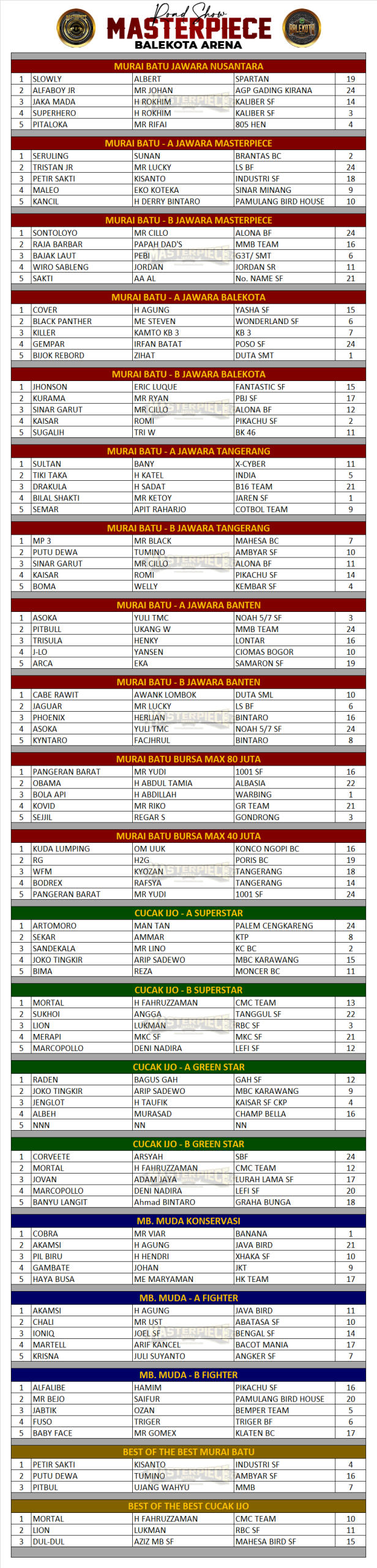 “Alhamdulillah, lomba berjalan lancar sesuai harapan. Terima kasih kicau mania yang sudah hadir memeriahkan acara ini. Selamat kepada para jawara, tetap semangat bagi rekan-rekan yang belum mendapatkan hasil. Sampai jumpa di gelaran Masterpiece berikutnya,” pungkas H. Azam.